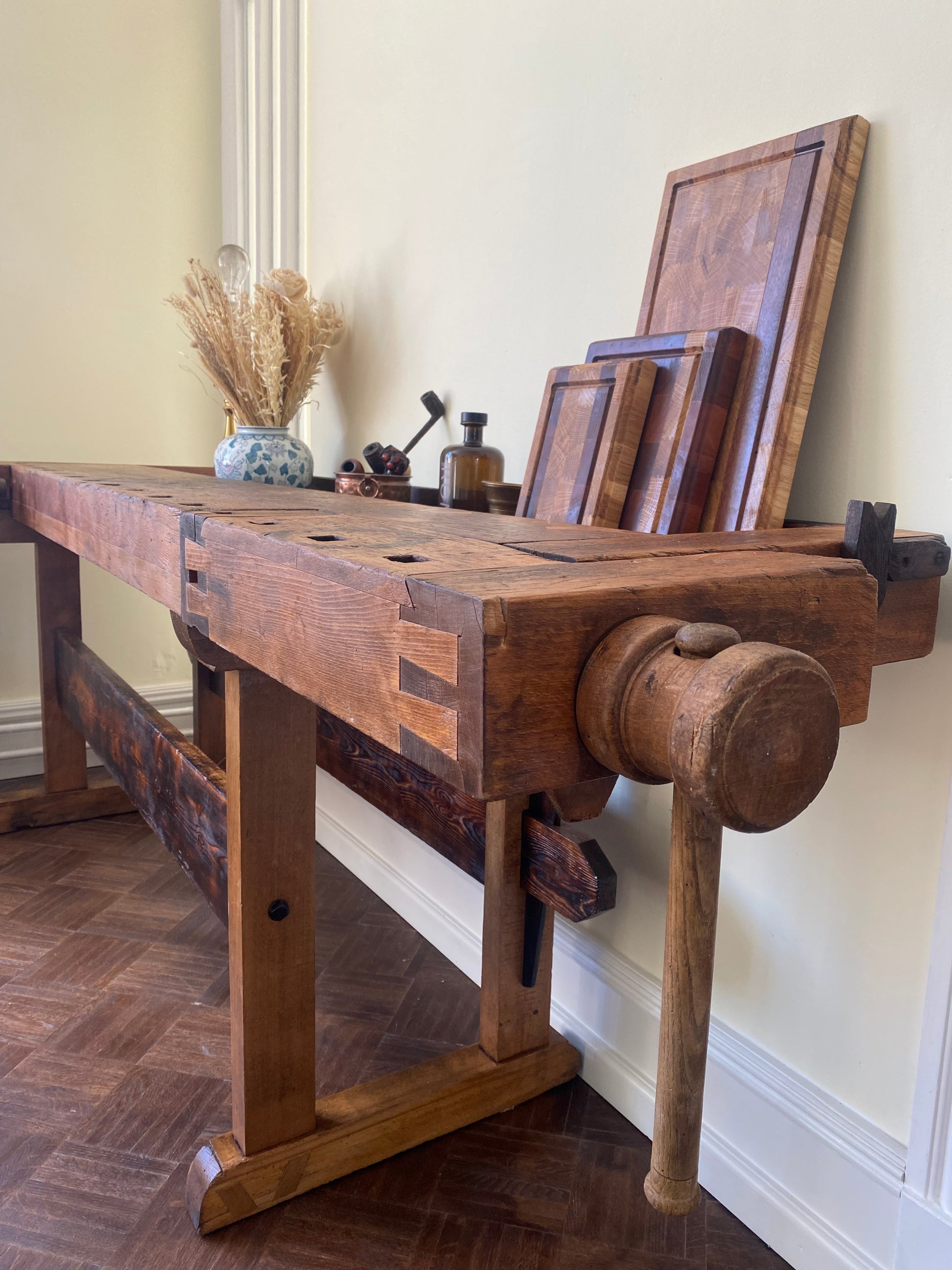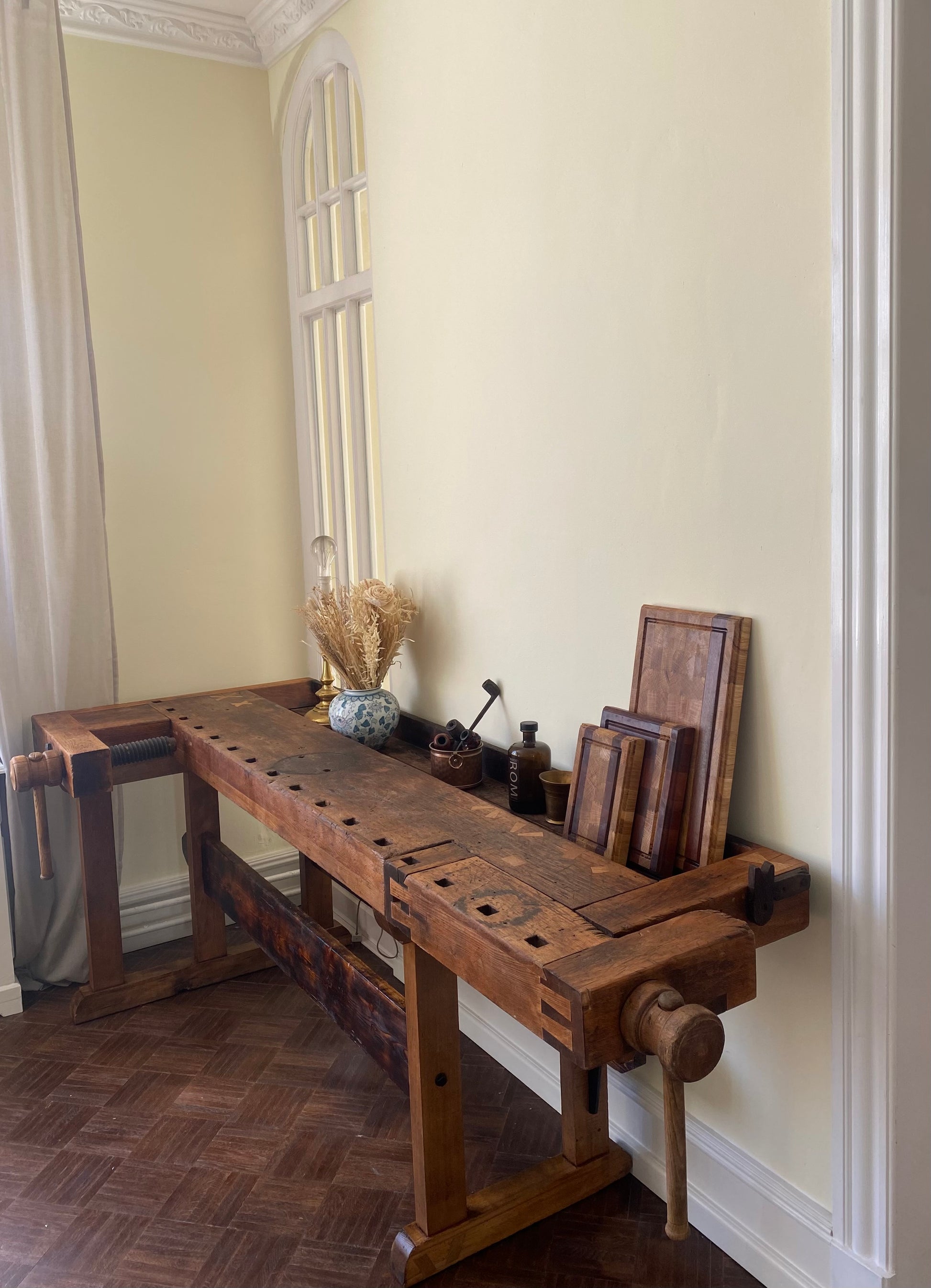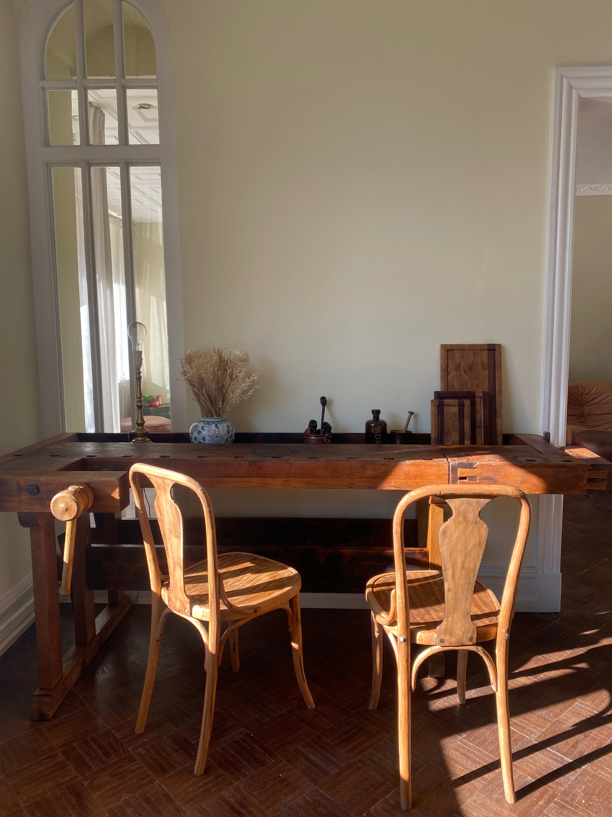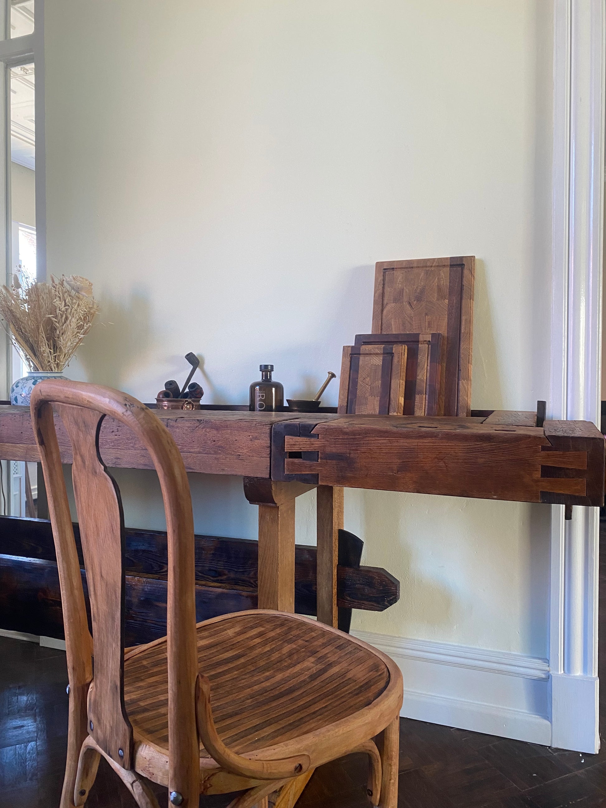 Denne gamle høvlbænk, der har været opbevaret i en lade i mange år, har endnu ikke fået lov til at gå på pension. Bænken har gennemgået en renovering, hvor der har været fokus på at bevare den autentiske slidtage, som den har opnået gennem mange års brug som arbejdsbord. Høvlbænken er nu blevet parret med ældre, renoverede franske caféstole.