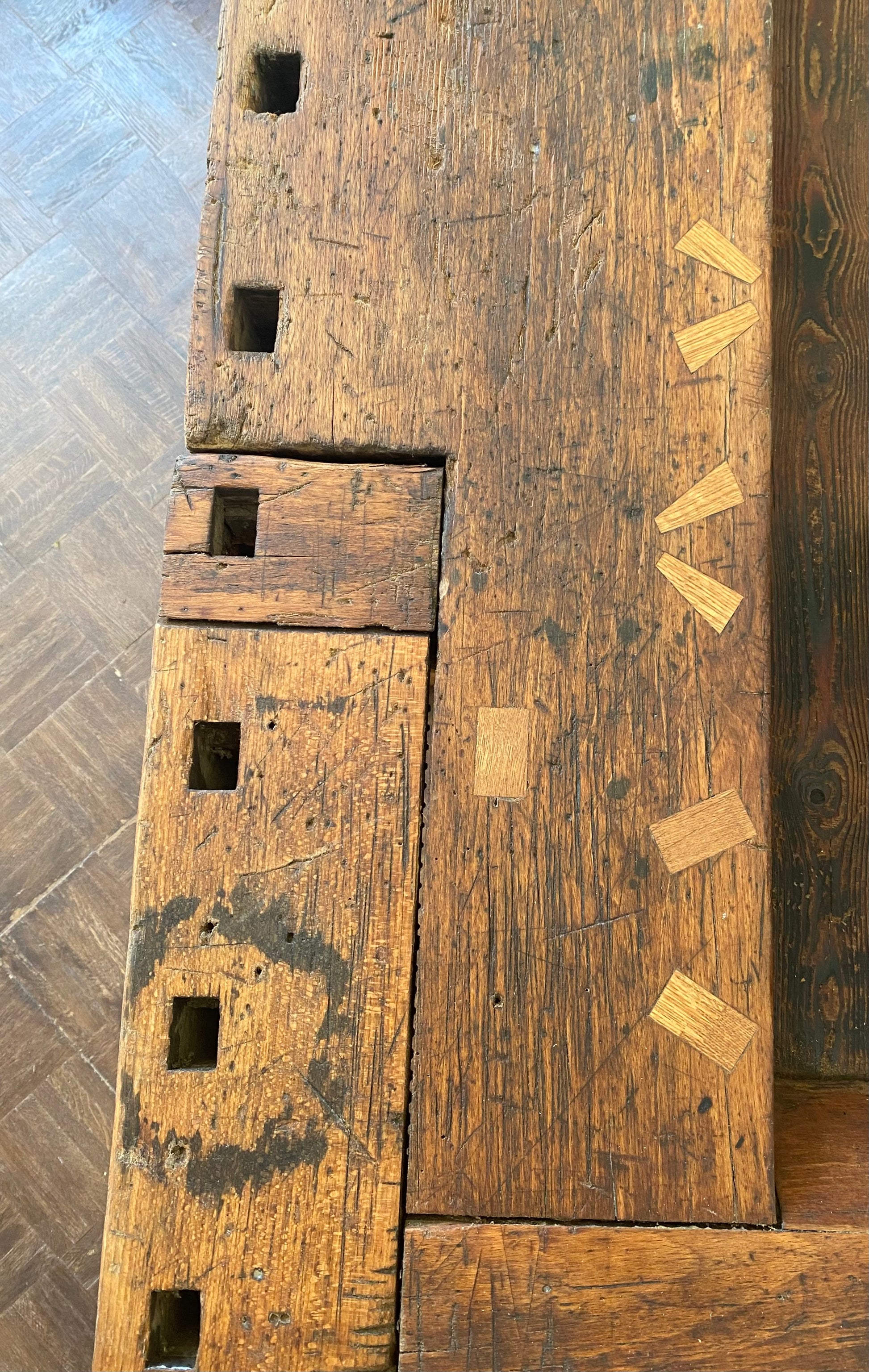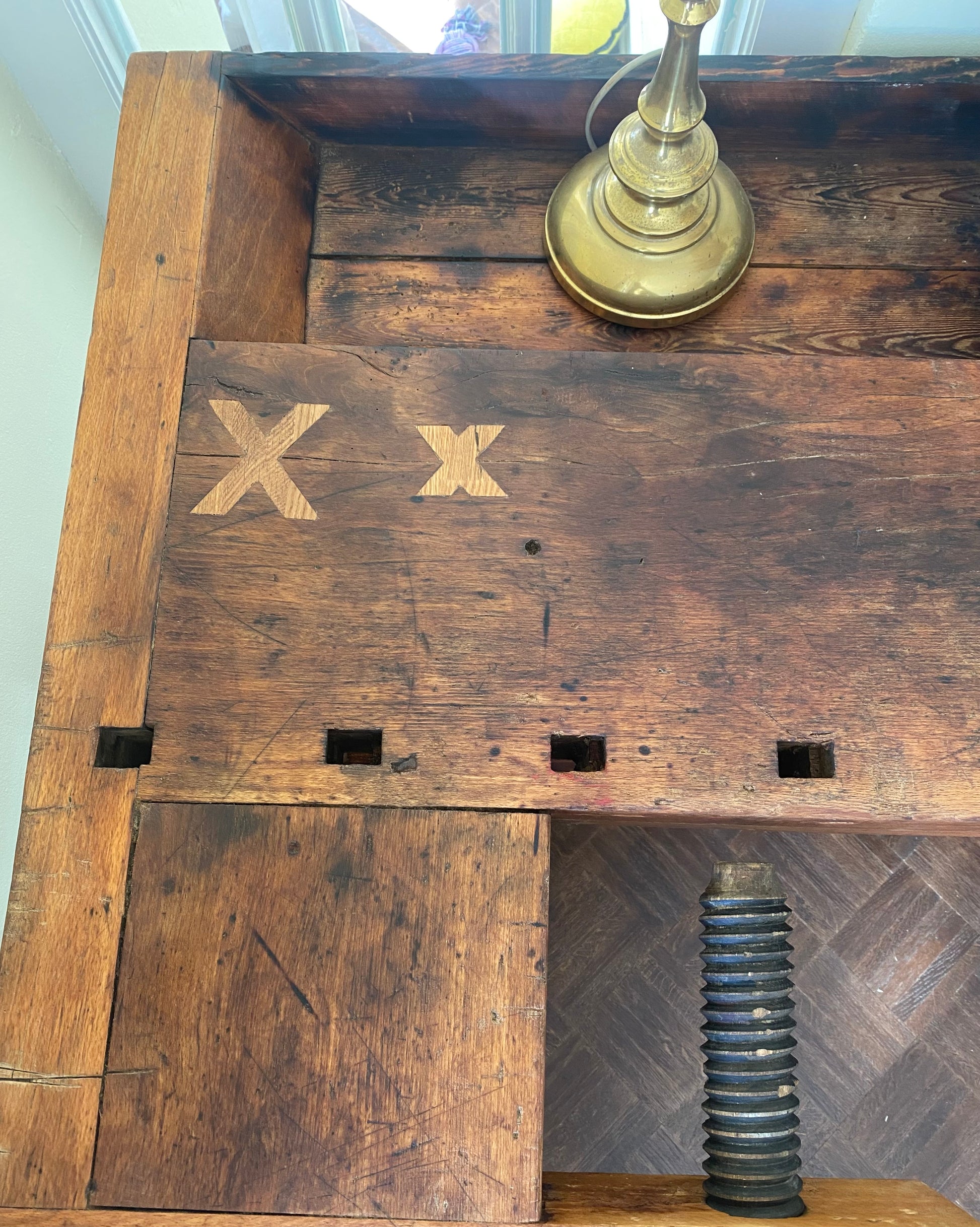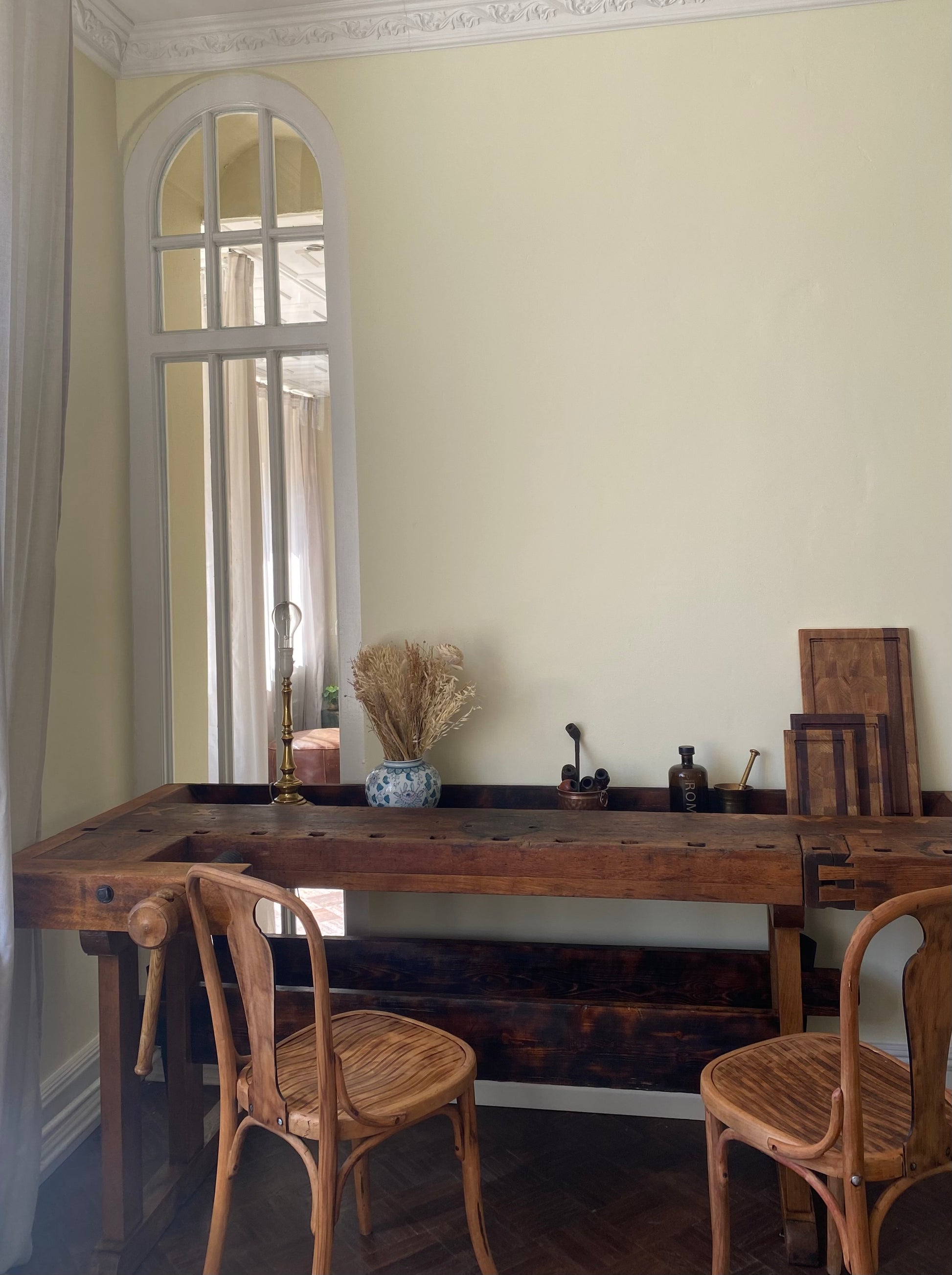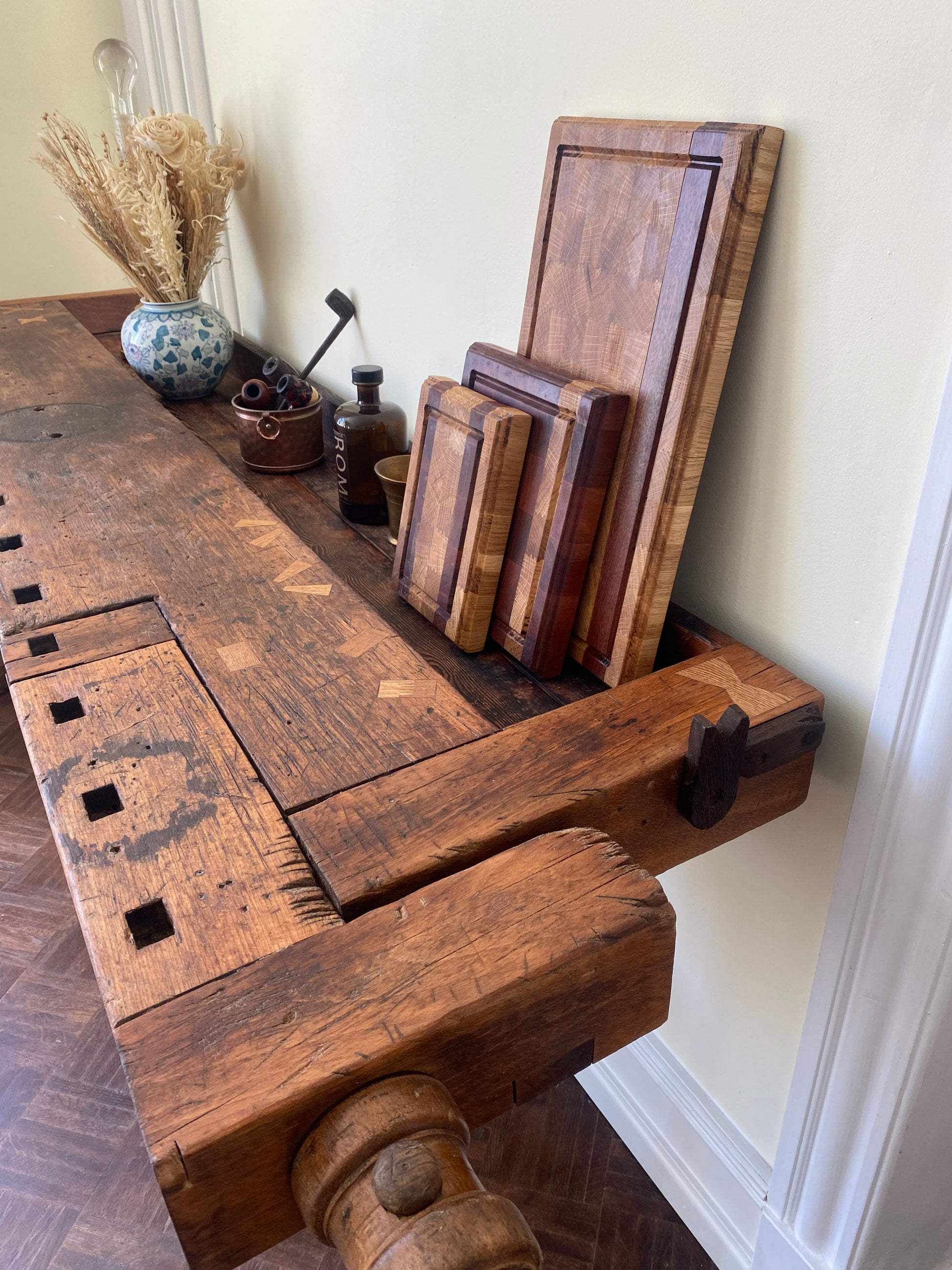 Denne gamle høvlbænk, der har været opbevaret i en lade i mange år, har endnu ikke fået lov til at gå på pension. Bænken har gennemgået en renovering, hvor der har været fokus på at bevare den autentiske slidtage, som den har opnået gennem mange års brug som arbejdsbord. Høvlbænken er nu blevet parret med ældre, renoverede franske caféstole.