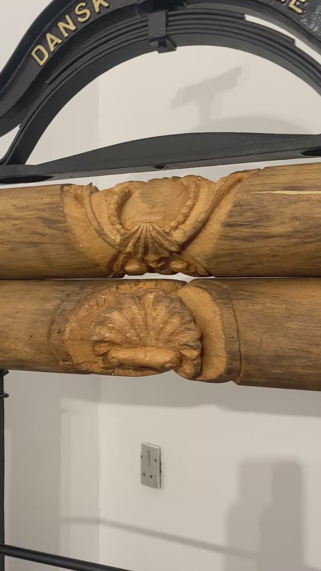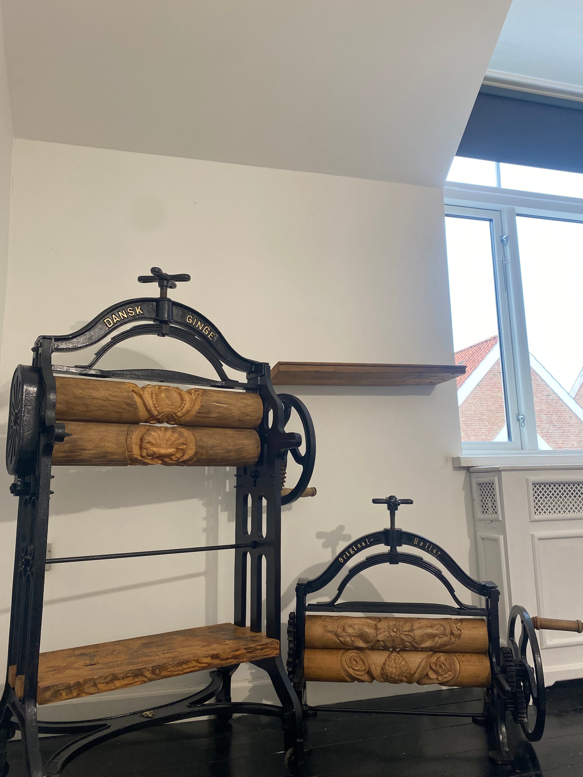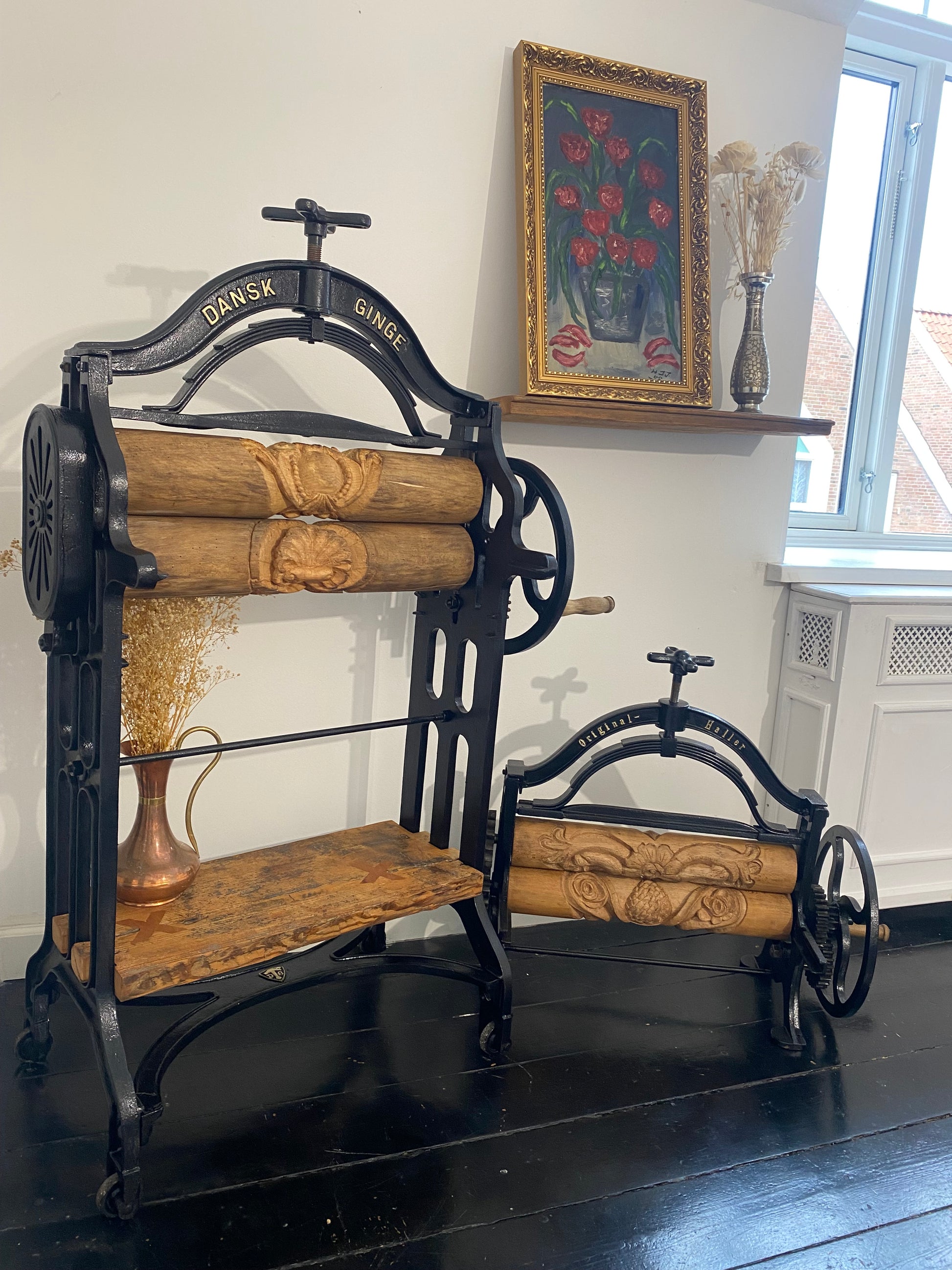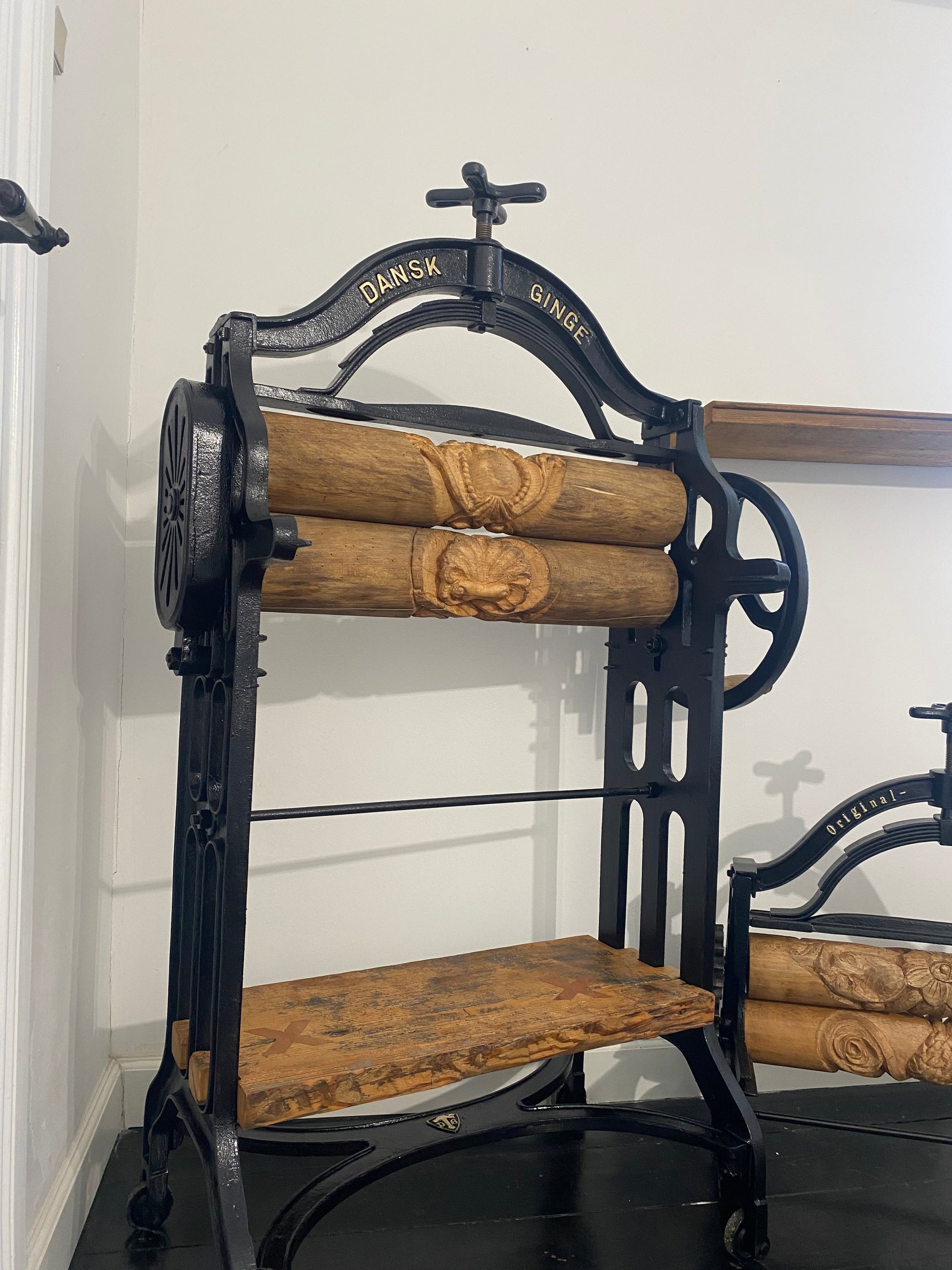 Renoveret håndskåret tøj-tromler, med hylder fra det originale gulv fra H.C Andersens hjem i Odense