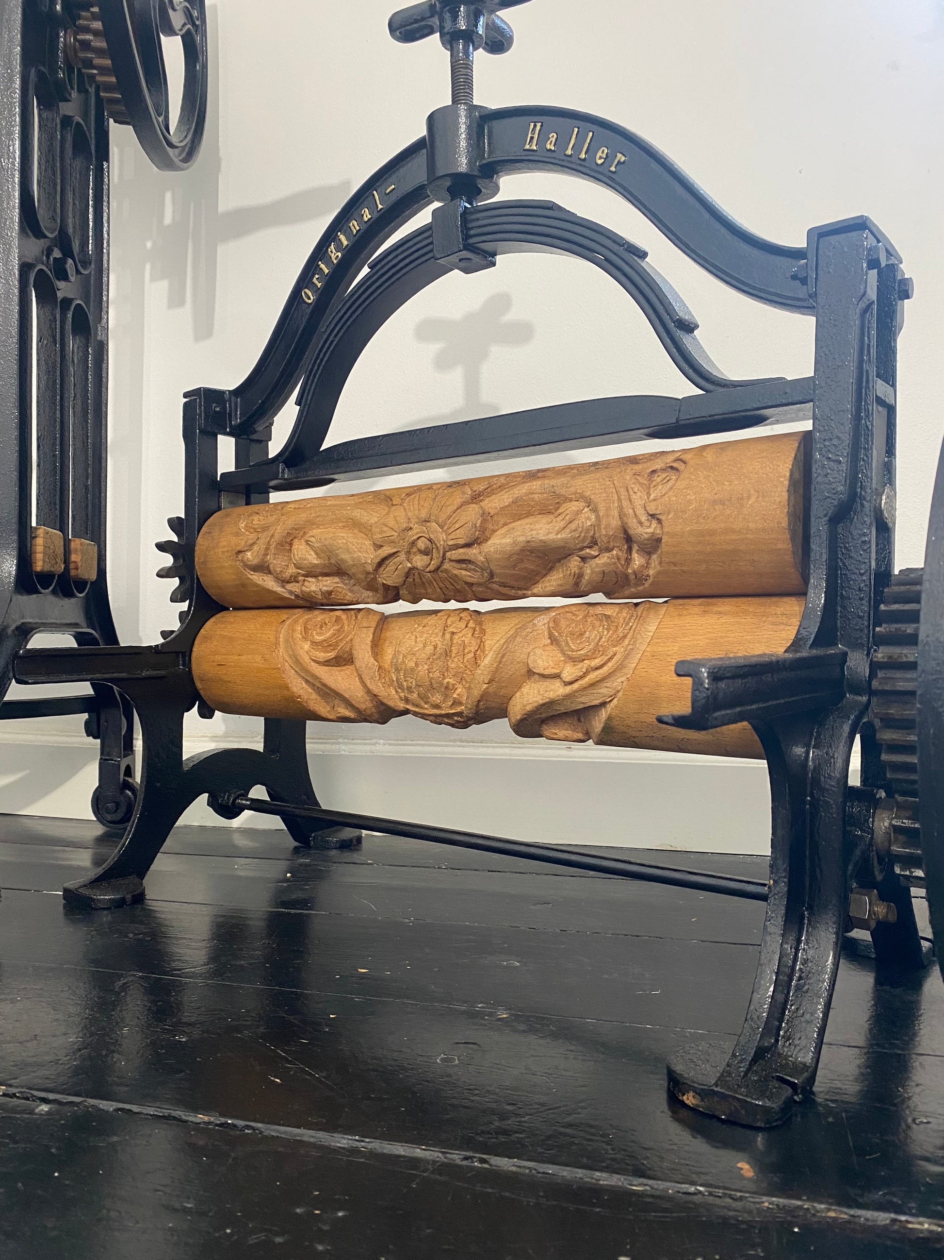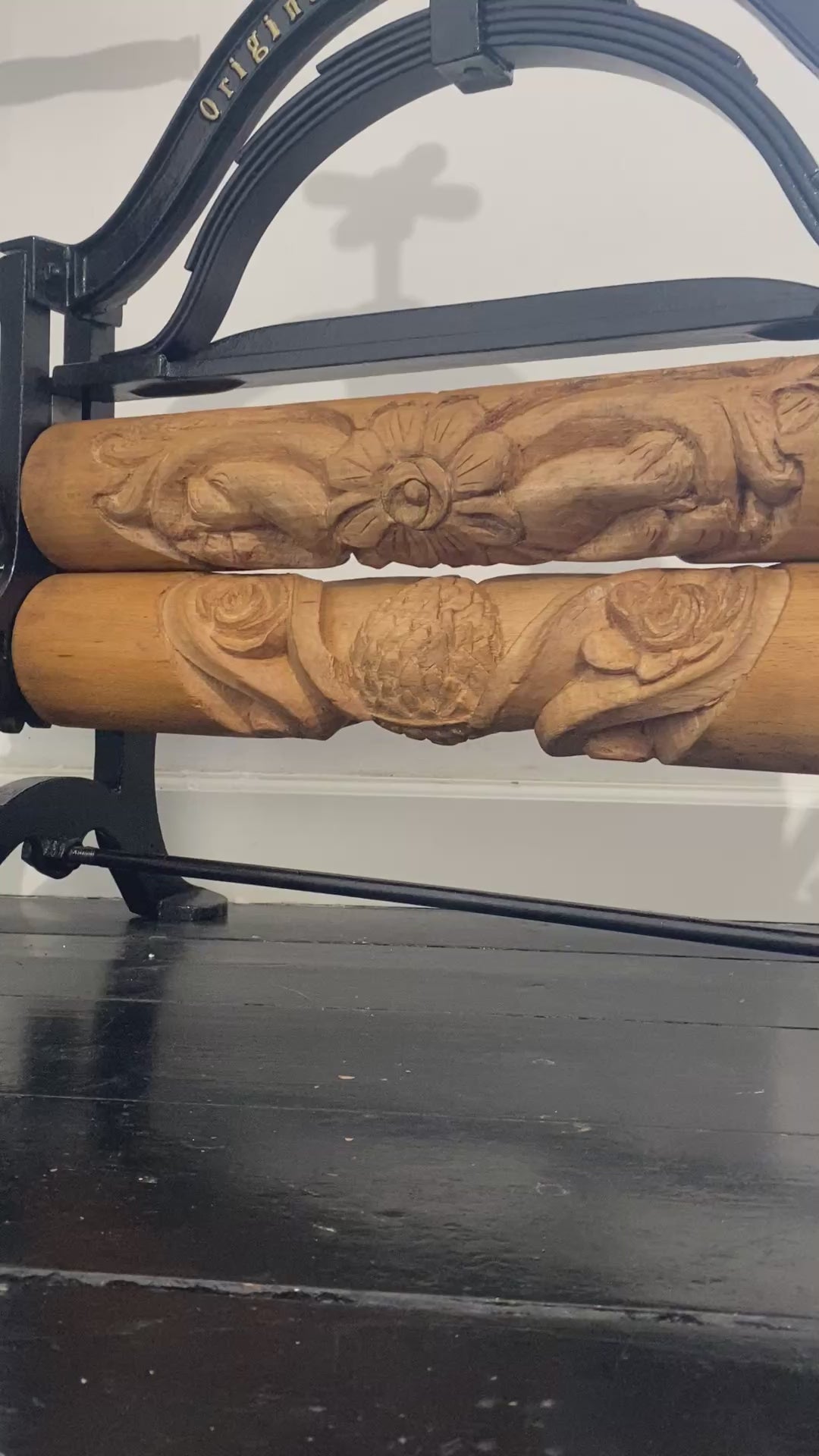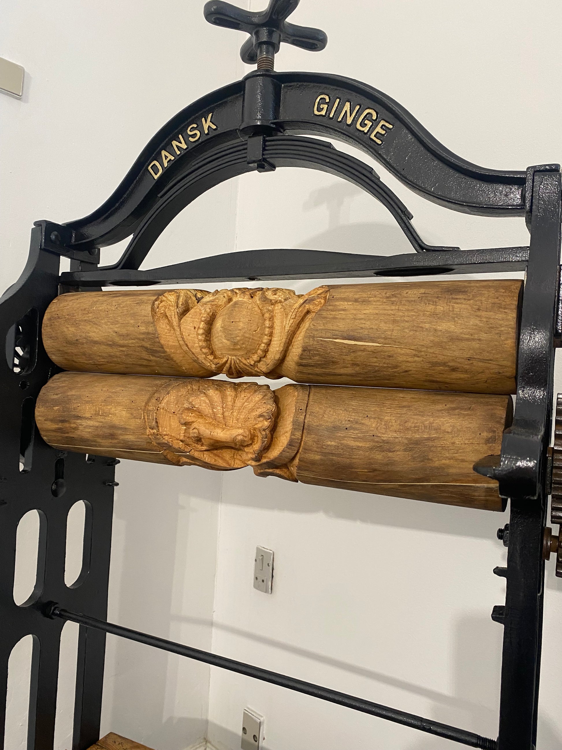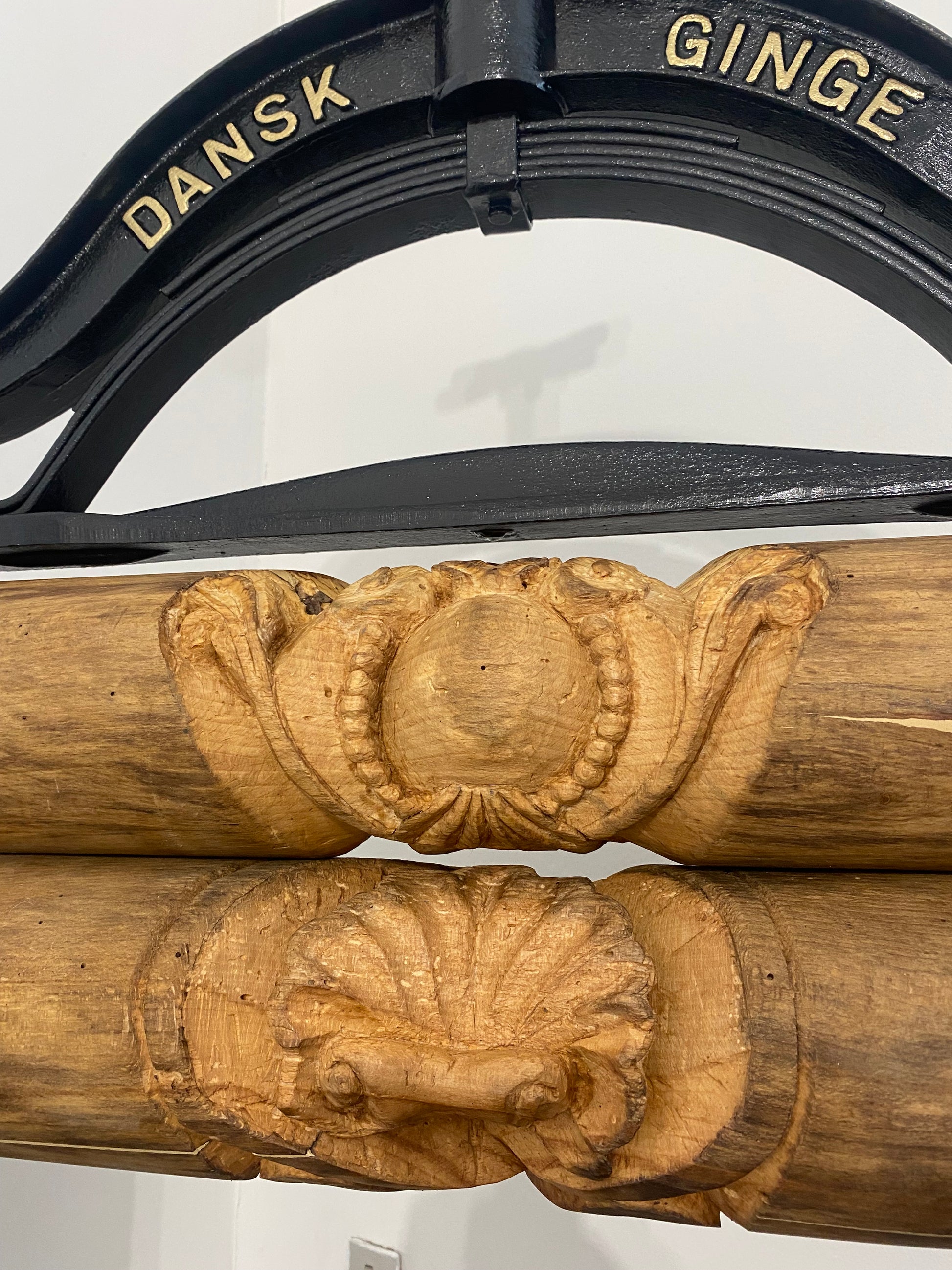 Renoveret håndskåret tøj-tromler, med hylder fra det originale gulv fra H.C Andersens hjem i Odense