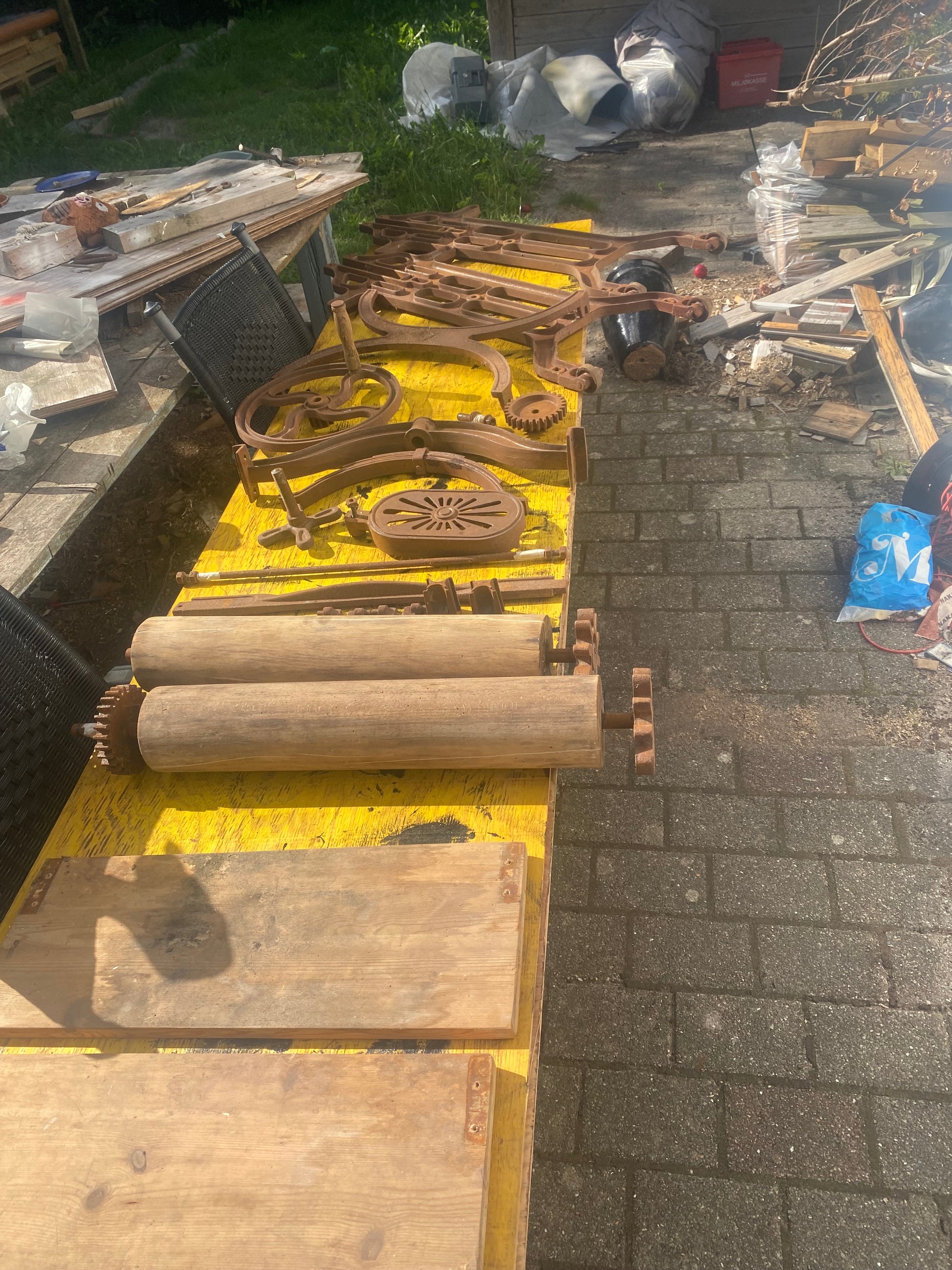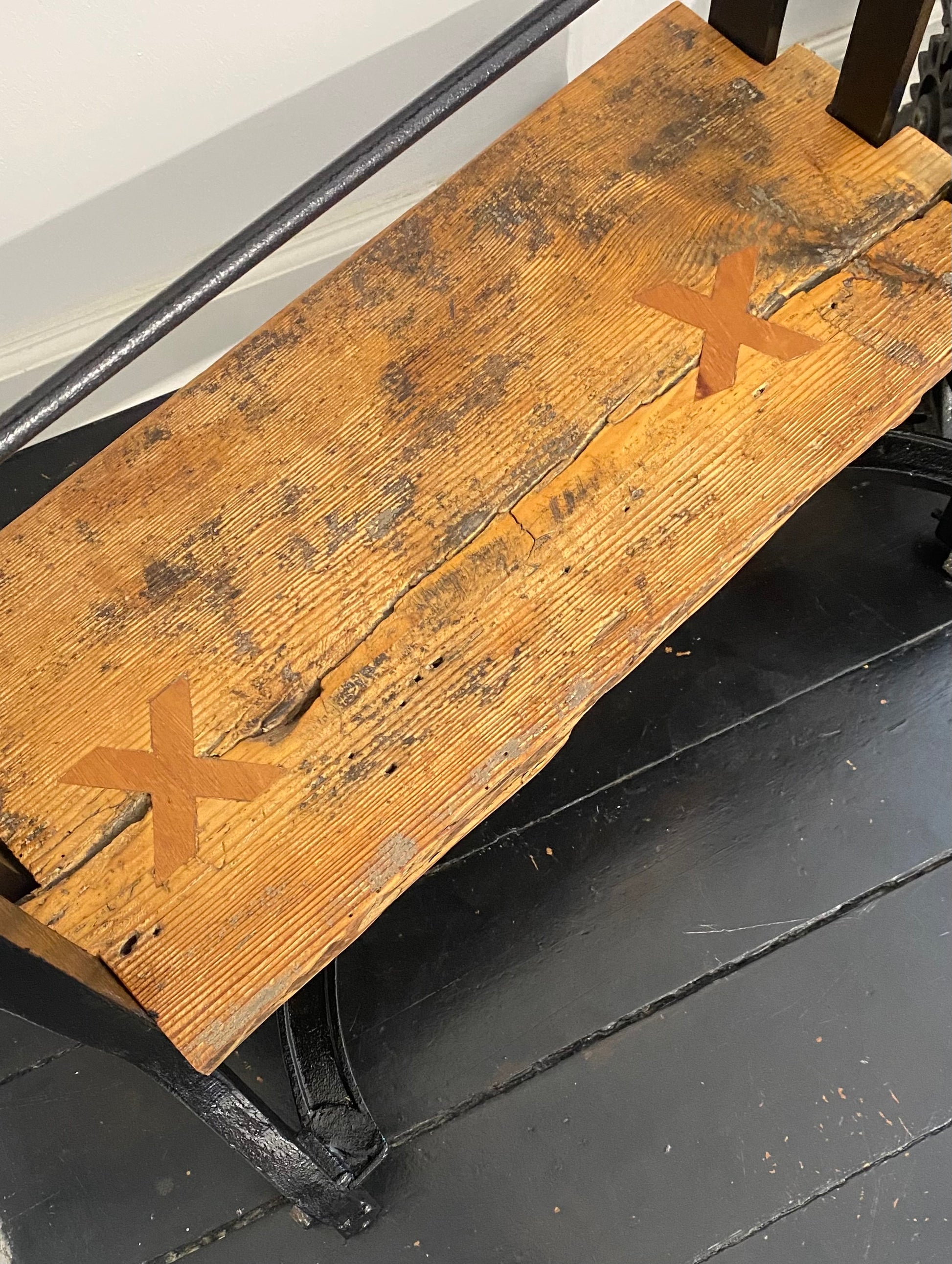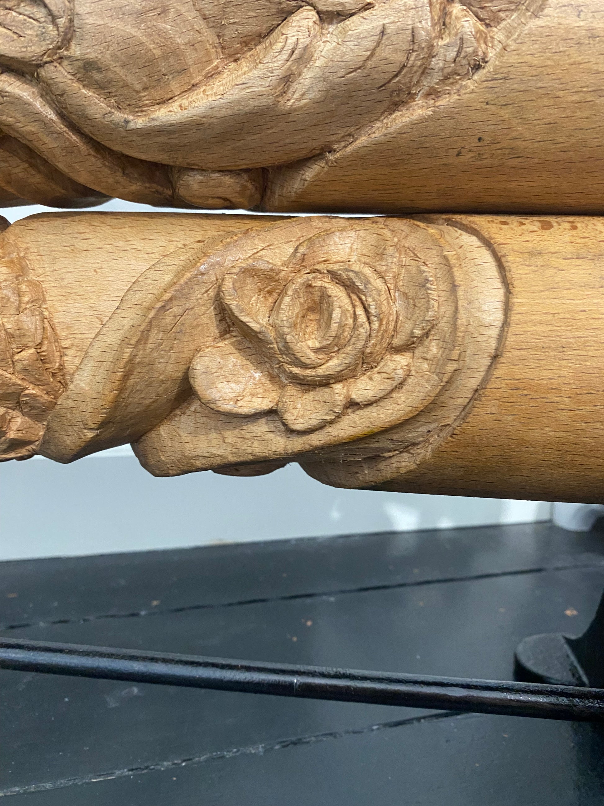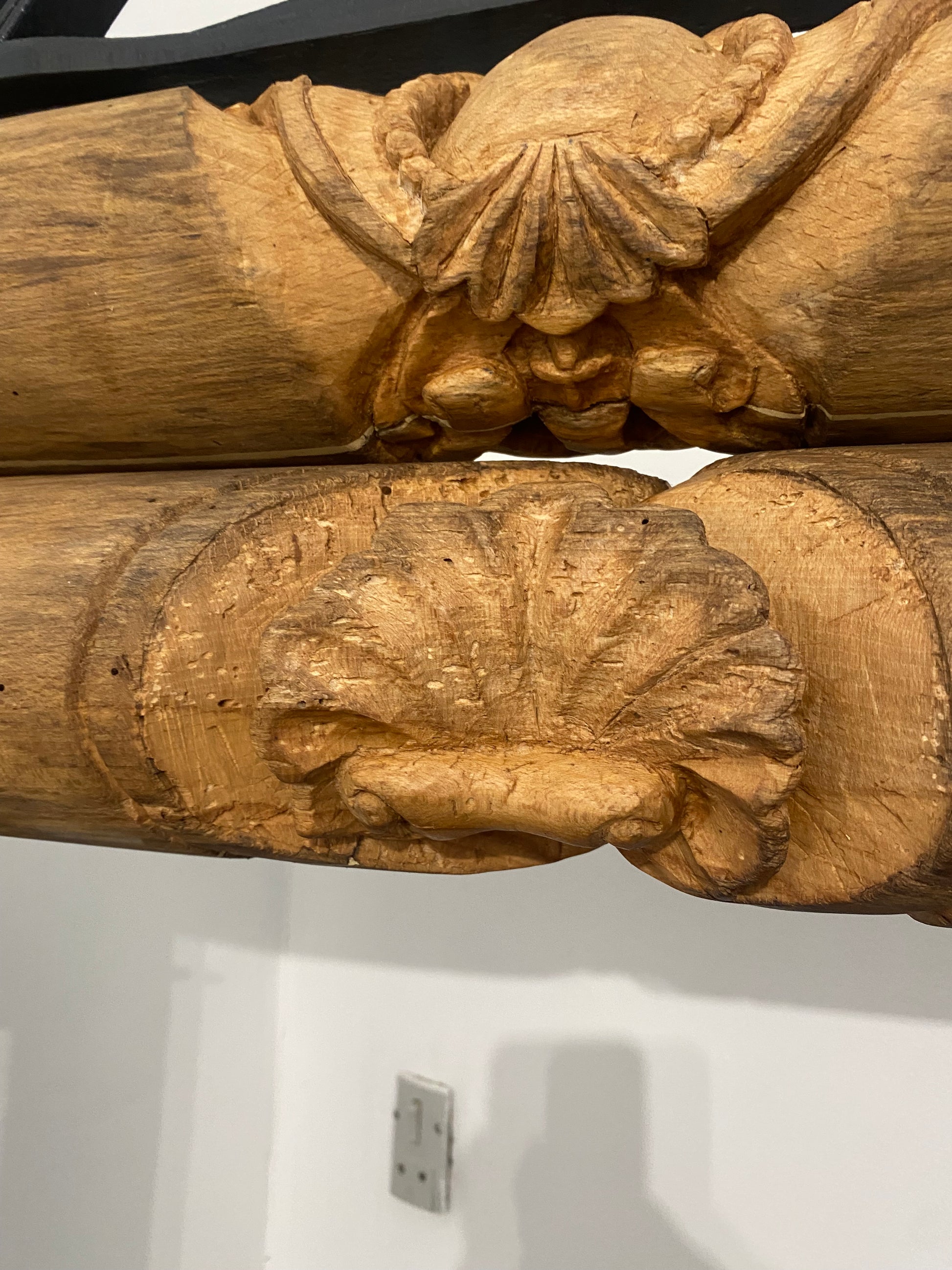 Renoveret håndskåret tøj-tromler, med hylder fra det originale gulv fra H.C Andersens hjem i Odense