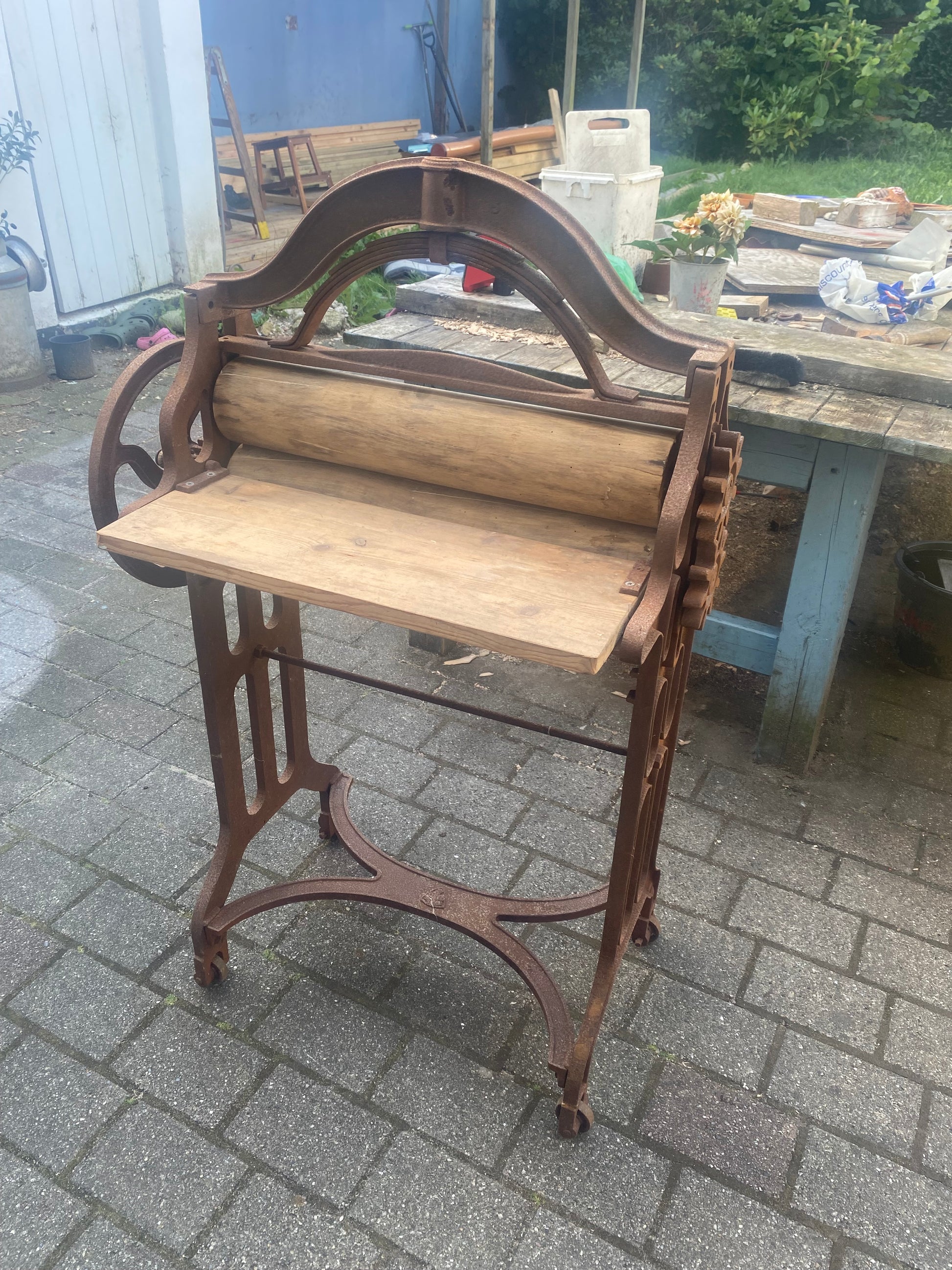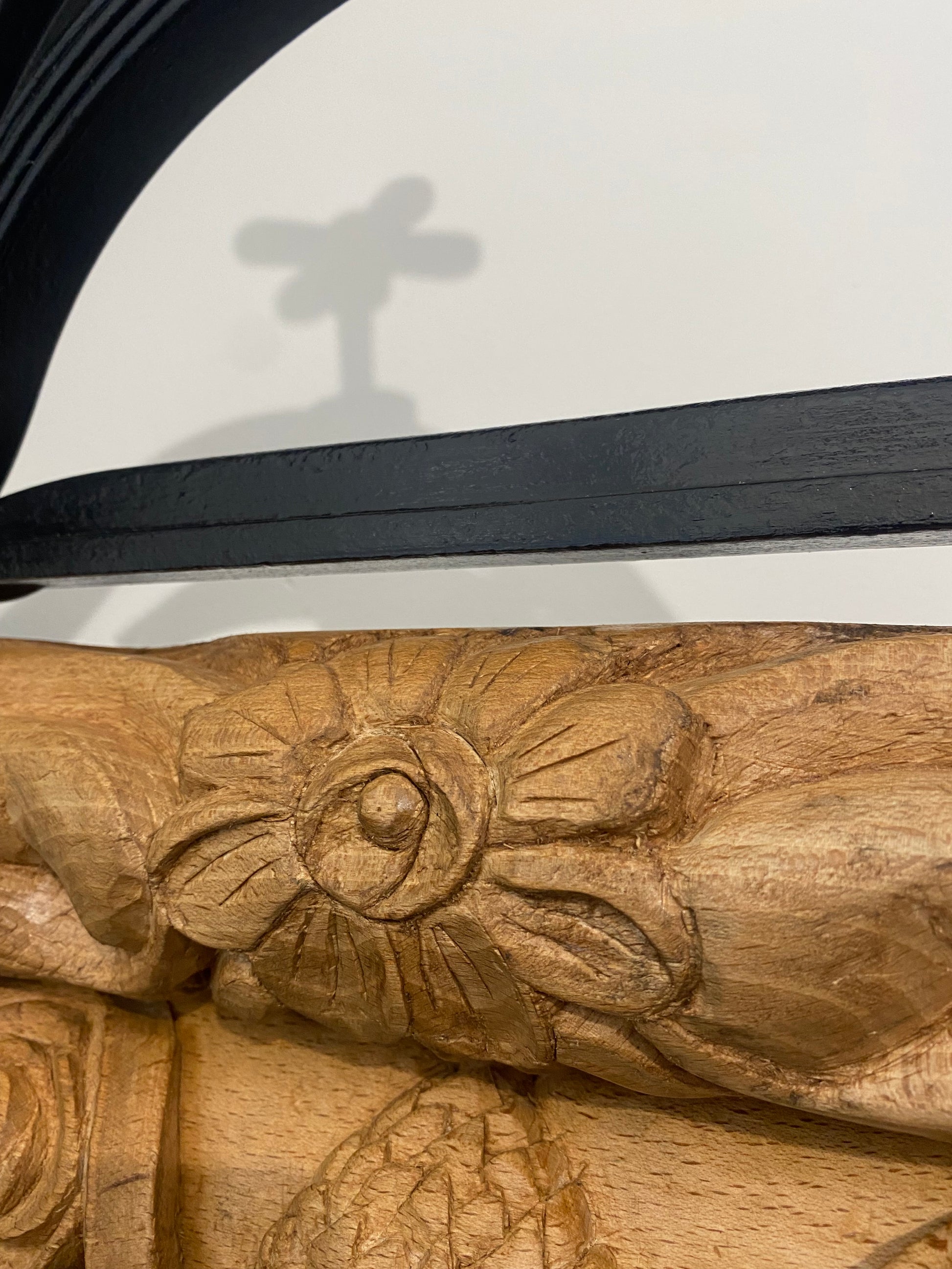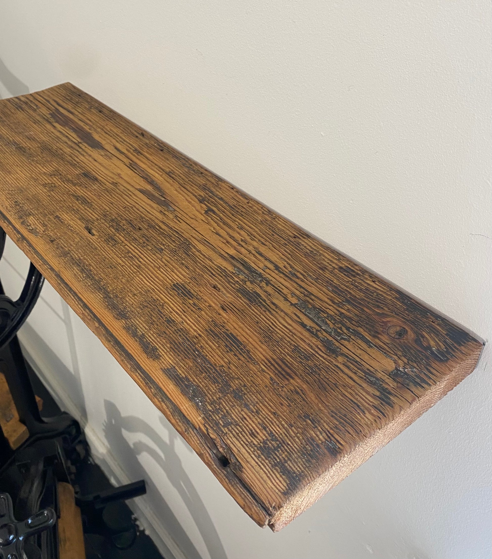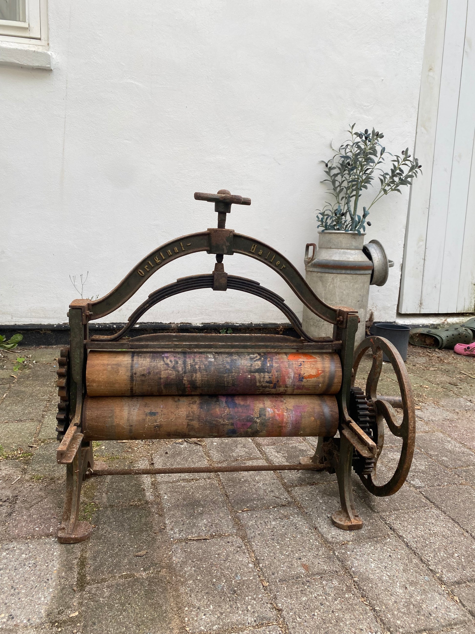 Renoveret håndskåret tøj-tromler, med hylder fra det originale gulv fra H.C Andersens hjem i Odense